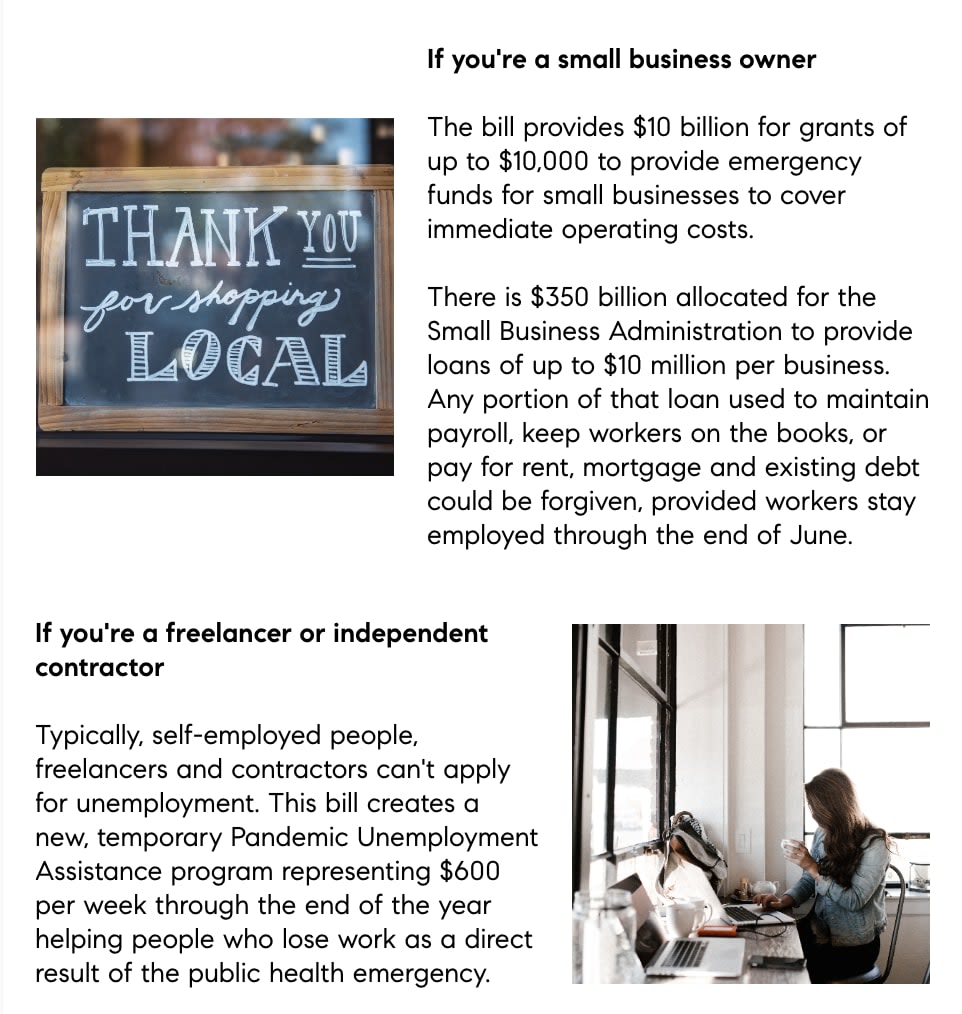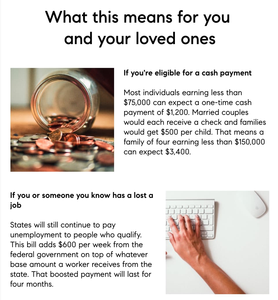 As we're all dealing with the effects of COVID-19 on our lives, I want to share encouraging news: the government has approved the $2 trillion Coronavirus Aid, Relief and Economic Security (CARES) Act which will help millions of people in this critical time. Perhaps even you.