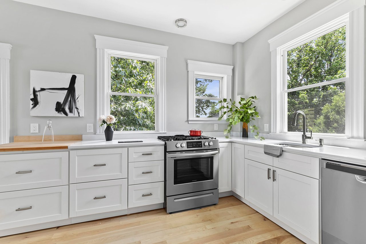 Walls were removed and a large island was added to expand the well-designed kitchen. The island has two glass pendants and an overhang that accommodates three stools for casual dining. The open plan has new white shaker-style cabinets and drawers, quartz and butcher block countertops, and a Frigidaire slide-in gas stove. The 36” GE French door refrigerator is between the island and the plentiful pantry cabinets. A Whirlpool dishwasher and a deep sink with a pull-down faucet rounds out the culinary amenities.