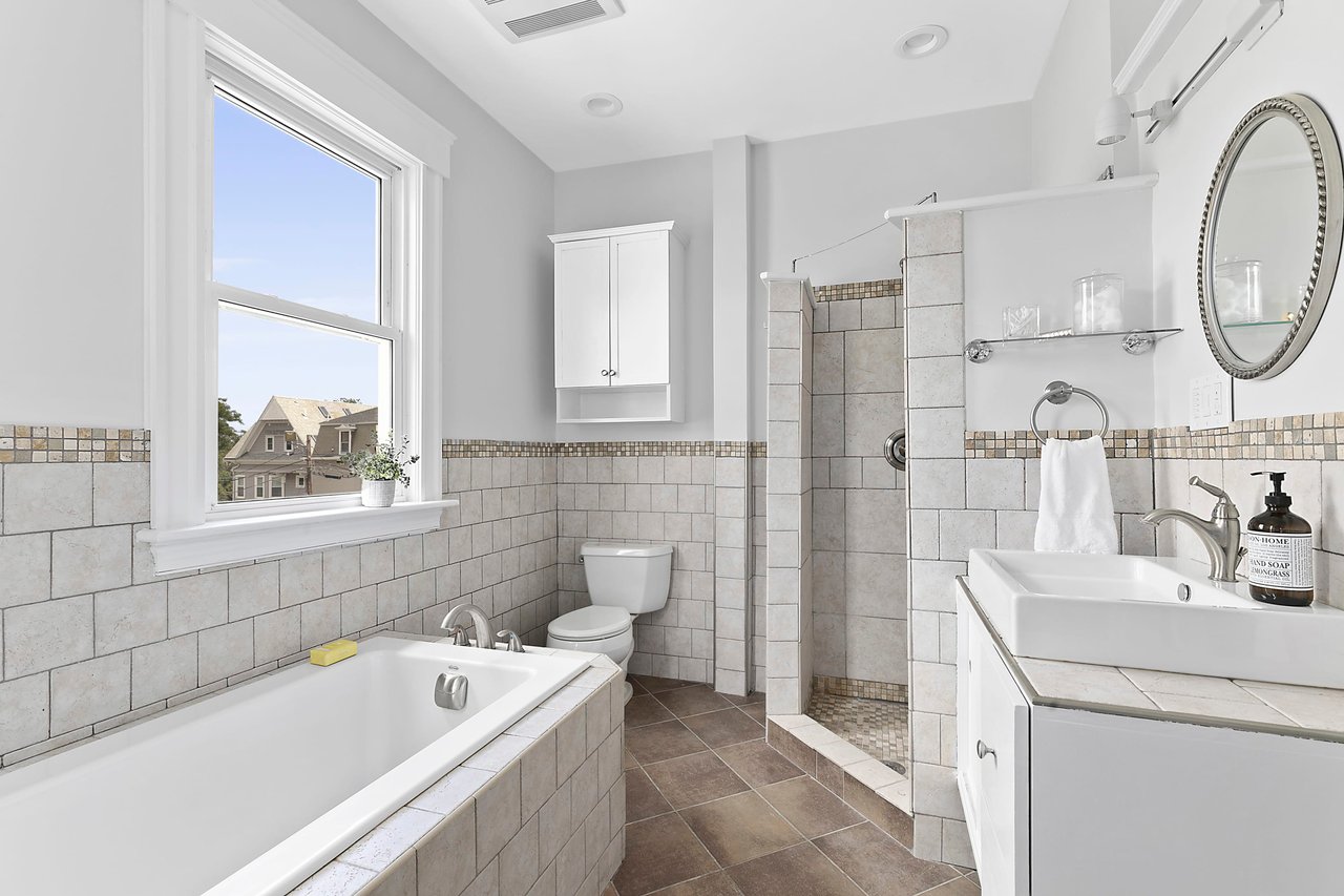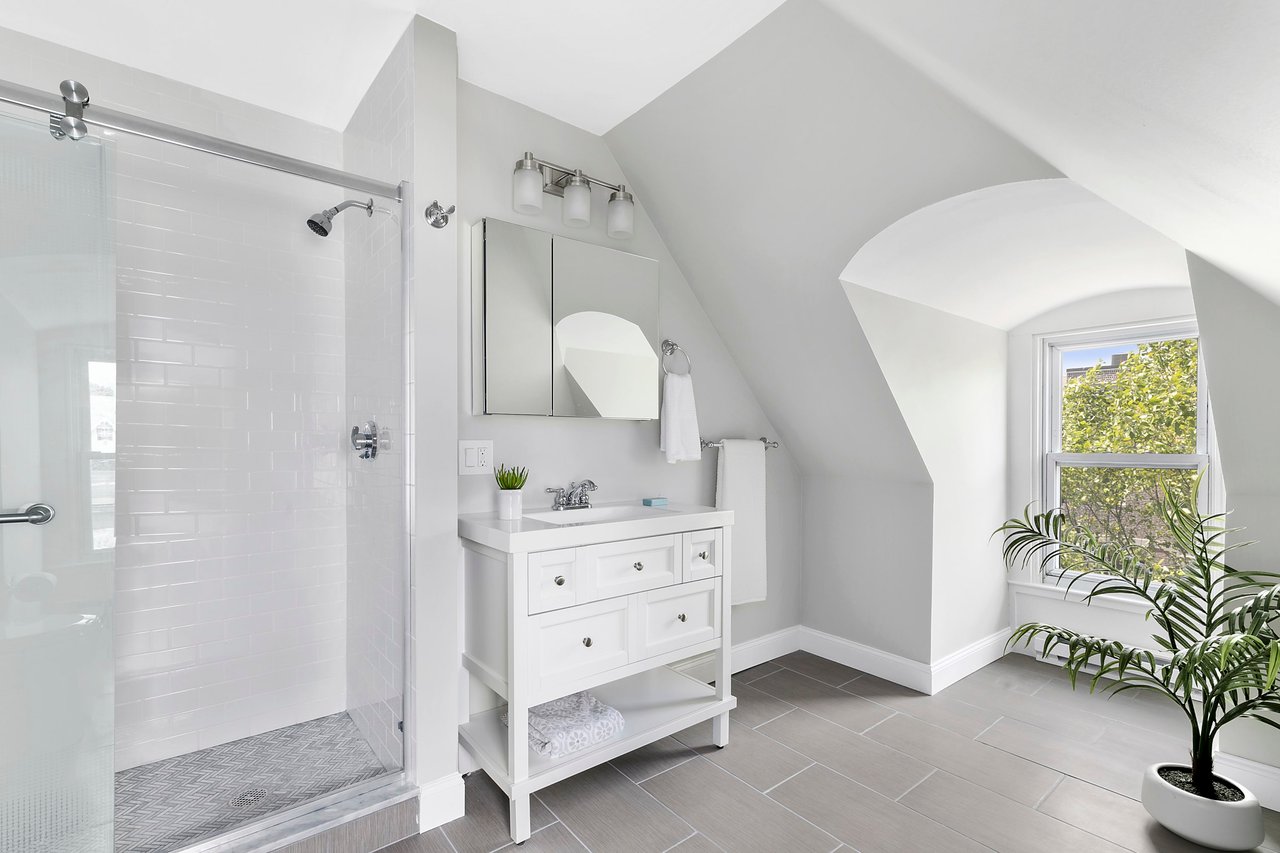 The newly added bathroom (2020) is absolutely stunning with its barrel-vaulted window openings and streaming light. A walk-in shower has subway tile surround, a herringbone tile floor and rolling glass shower doors. The overall flooring is large format tile. And, a tasteful vanity with a mirrored medicine cabinet. The American Standard toilet is a water-saving dual flush.