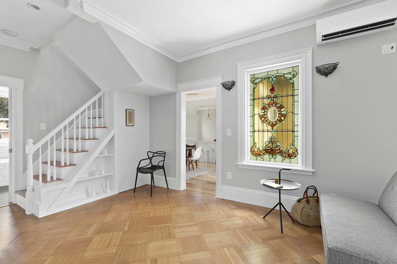 Upon entering this home, you are welcomed into a gracious foyer with high ceilings, a decorative stained-glass window, deep crown moldings, and a roomy coat closet.