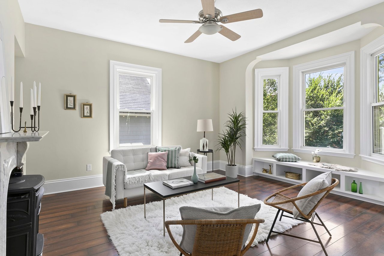 The second main room would equally be suitable as a family room or ensuite bedroom. This room has a beautiful marble mantel with a gas stove insert and a window seat built into the bay. It’s attached bathroom has a tile floor, a walk-in shower with a built-in bench, and a single sink vanity.