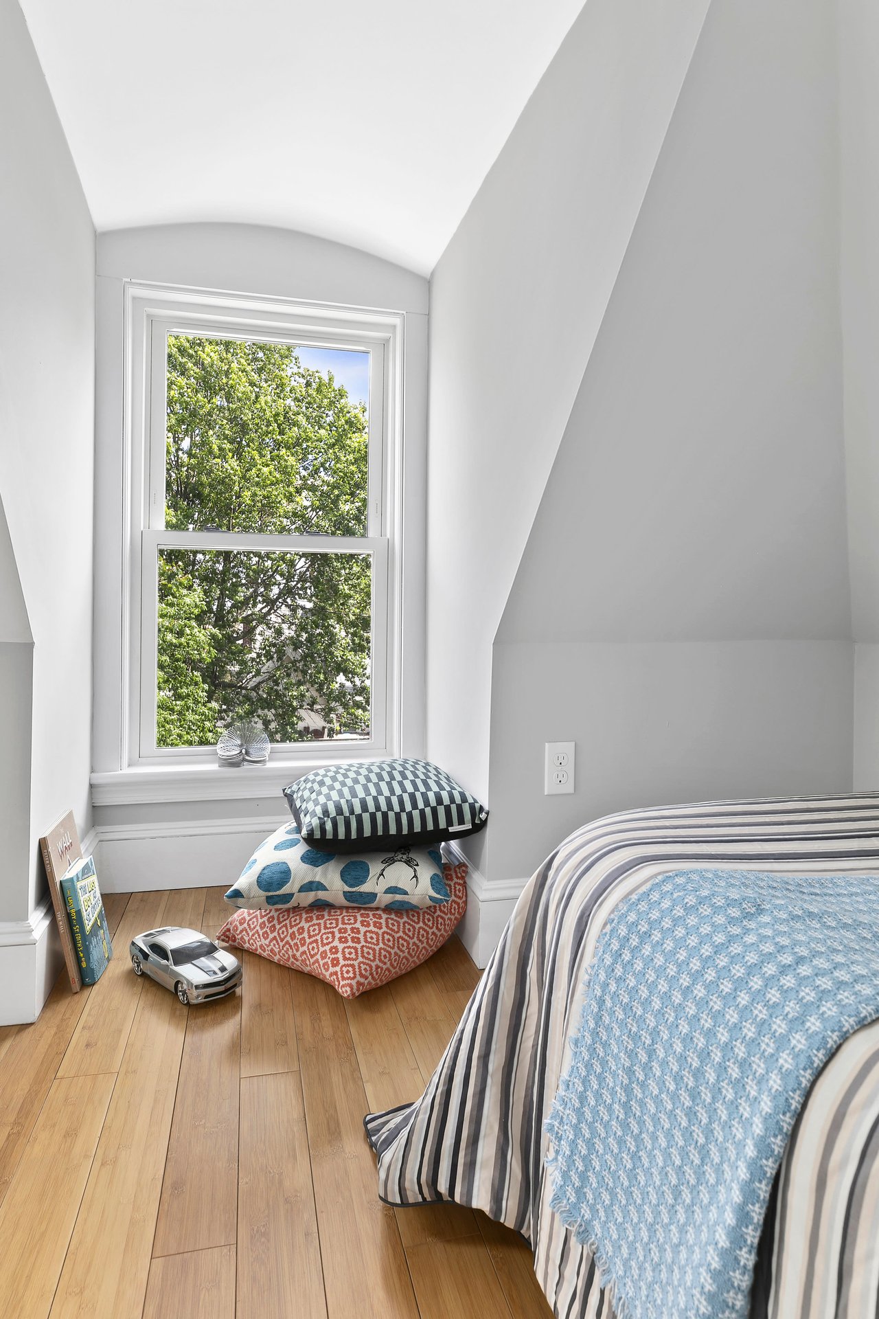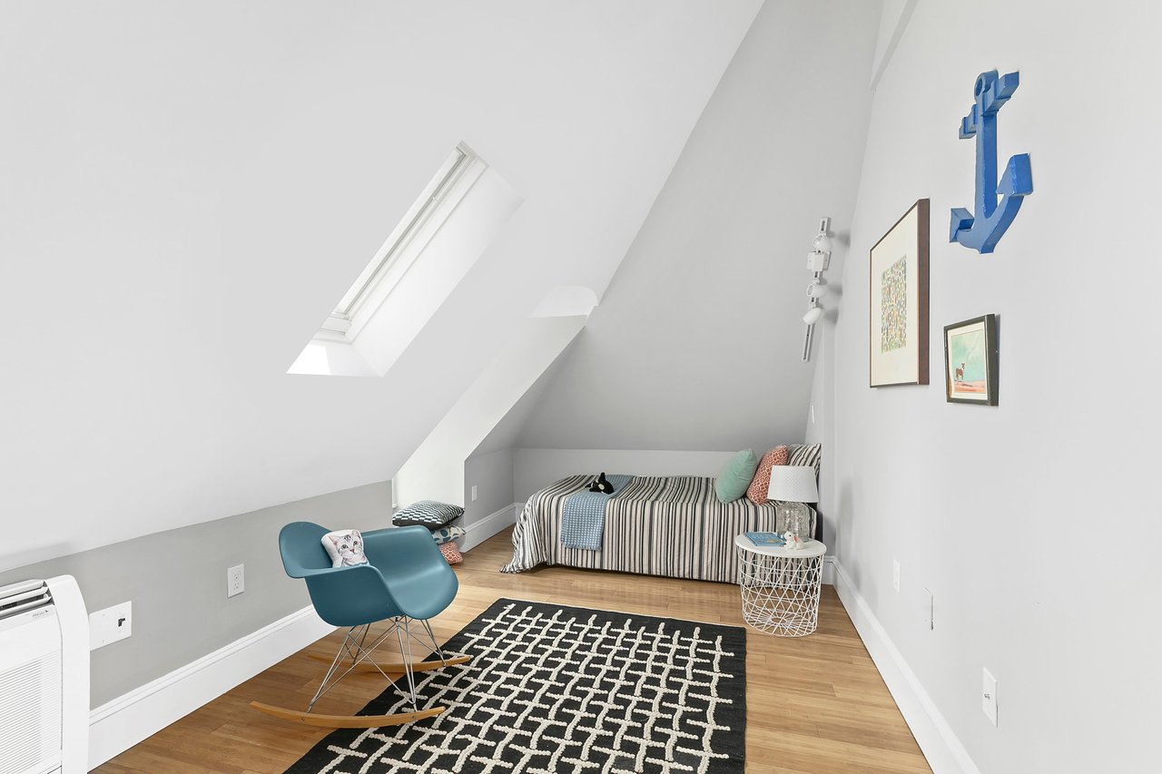 Upstairs you’ll find whimsical structural ceiling lines, vaulted and curved with skylights and special nooks and crannies with two additional bedrooms and a brand-new full bathroom. Next to the stairs is a fun child’s play area or a great extra storage spot.
