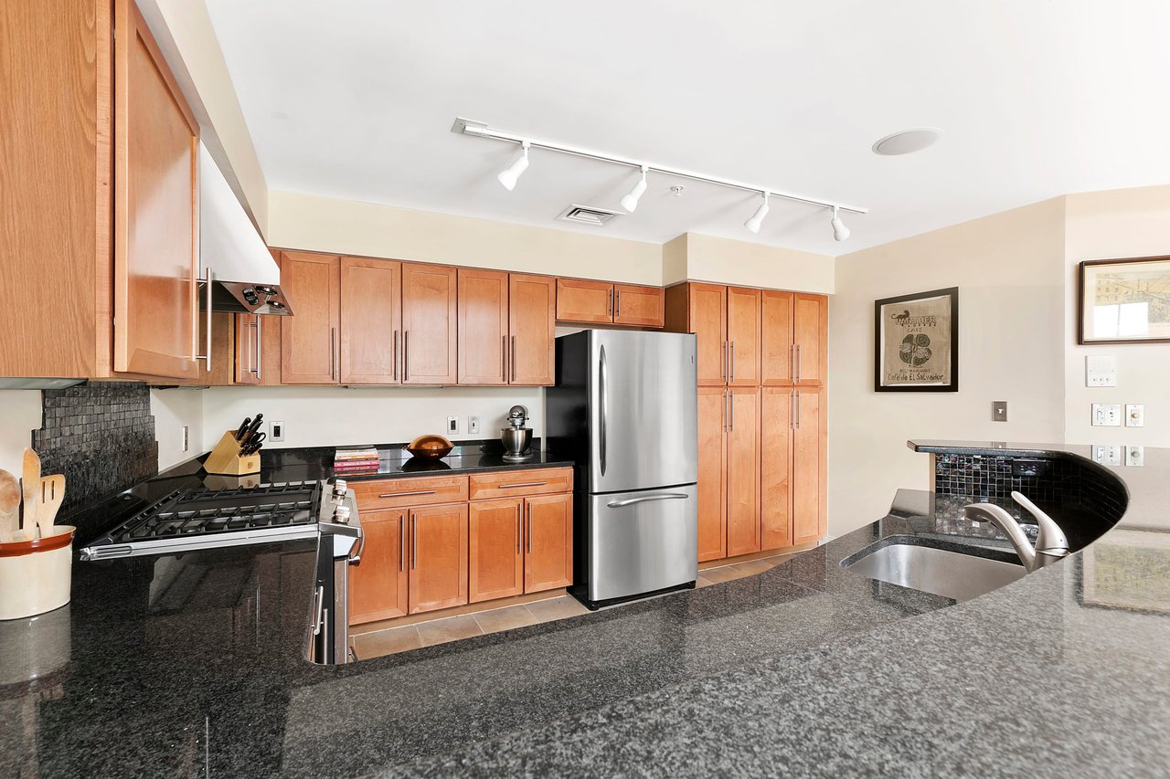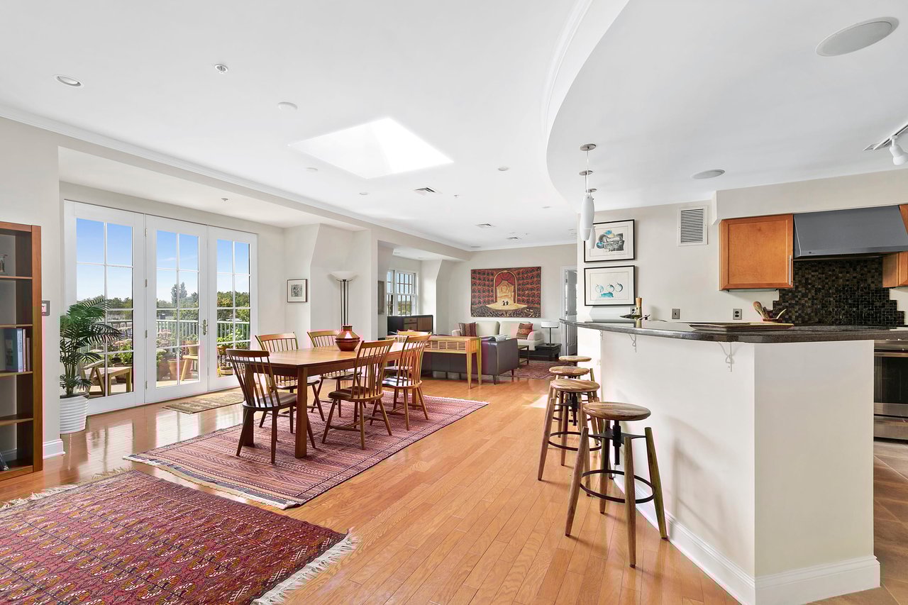 Transformed from a 1960’s residential complex into a high-end elevator building in 2007—this penthouse unit has dramatic ceiling height, an enormous skylight, hardwood floors, a wonderful patio with great views and an appealing open layout with two large ensuite bedrooms and two parking spaces, one of them in the garage. The kitchen features a dynamite 11-foot curved granite island with plentiful wood cabinetry and a GE Profile appliance suite. This location is convenient to everything—a few blocks from both Porter and Davis Square red line MBTA stops, the bike path and a plethora of restaurants, groceries, and specialty shops. This is a professionally managed building with high owner occupancy—it checks all the boxes for a low maintenance, no worry home in Cambridge.
