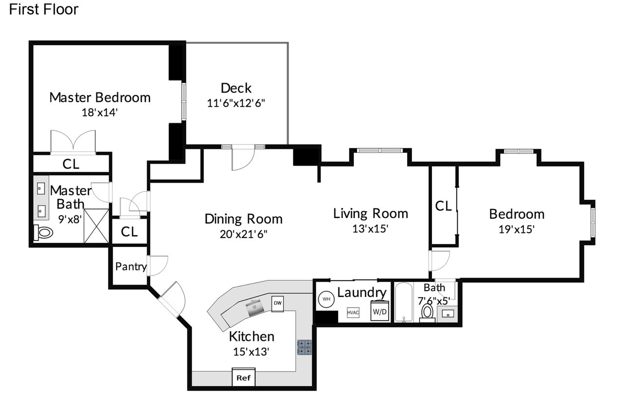 Dining room: Flanked by the kitchen and the French door to the deck, a large dining table can be perfectly placed under the enormous skylight. There are recessed lights and crown molding, which adds a touch of elegance.