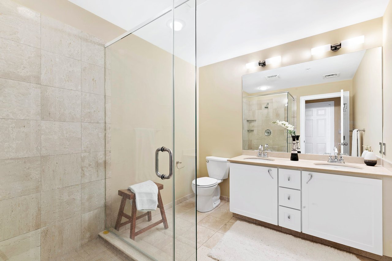 Ensuite bathroom: Oversized walk-in glass-enclosed shower with marble tile surround. Marble vanity top, double sink, white cabinetry and polished marble flooring.