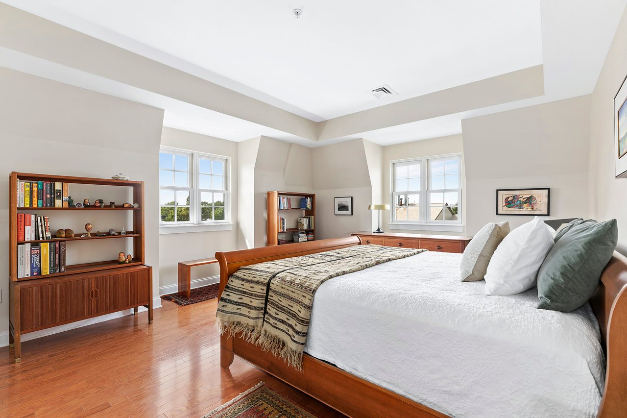 Second bedroom: Corner exposure with two sets of windows, recessed lighting, a double closet, and this room can also accommodate a king-sized bed.