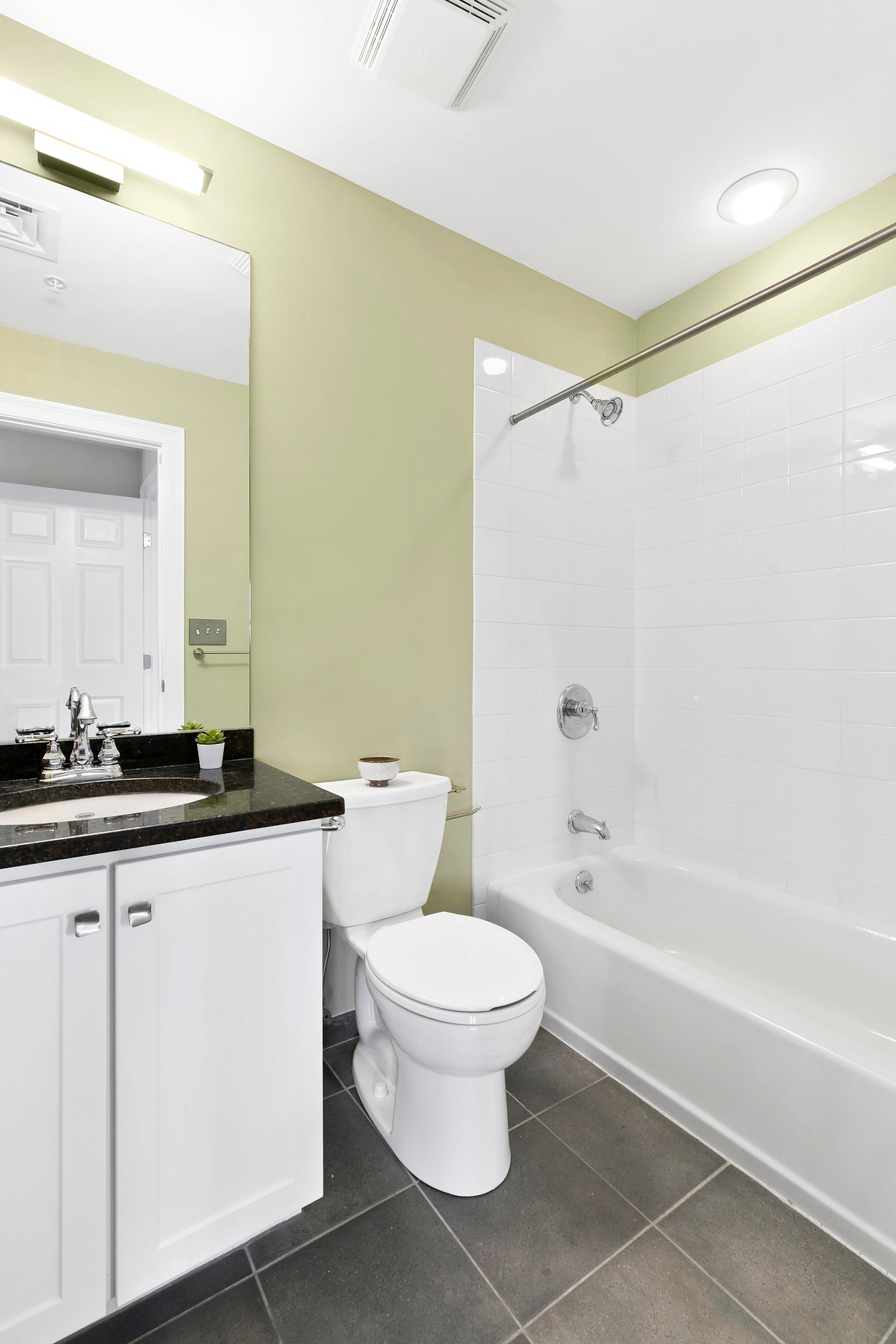Ensuite bathroom: Granite-topped vanity with white cabinetry, bathtub/shower combination with white tile surround and tile flooring.